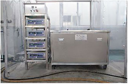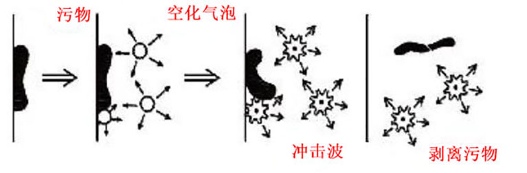 空化效果是利用空化氣泡在突然破裂時(shí)發(fā)出的沖擊波將污物從產(chǎn)品表面利離。剝離下來(lái)的污物受加速度牽引分離破壞,并由直進(jìn)流作用分散去除。