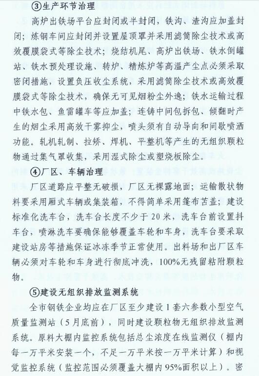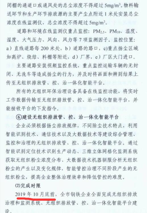 2、2019年10月底前,全市鋼鐵企業全面完成無組織排放治理和監測、無組織排放管、控、治一體化智能平臺建設。