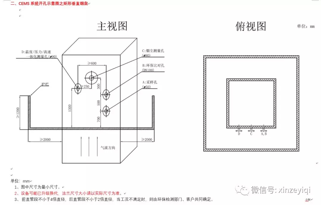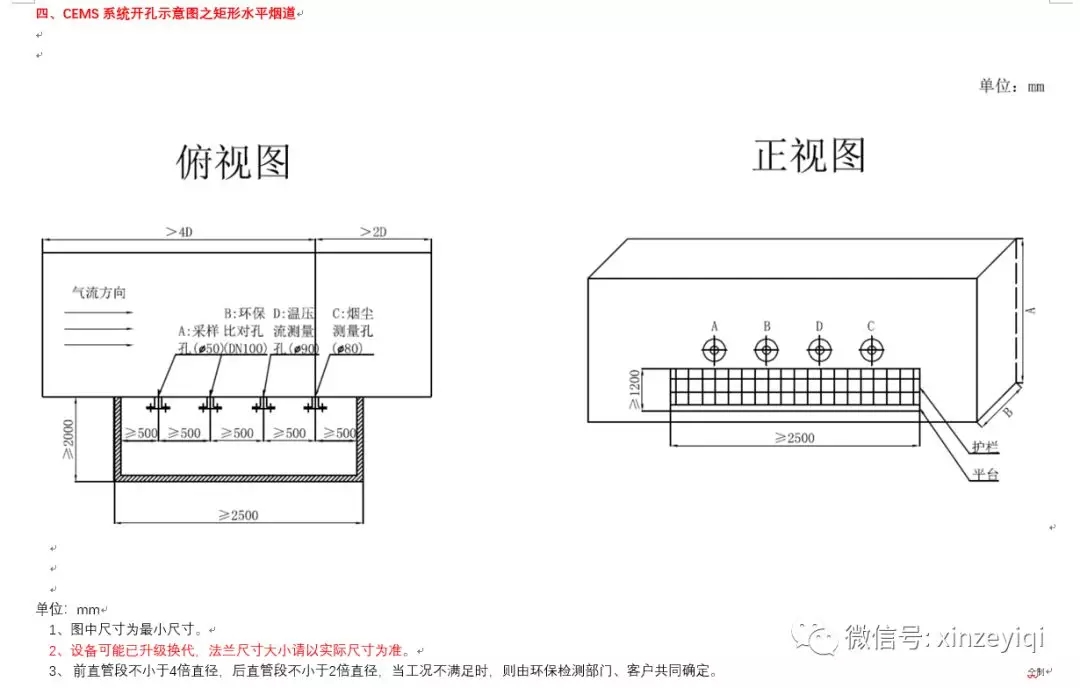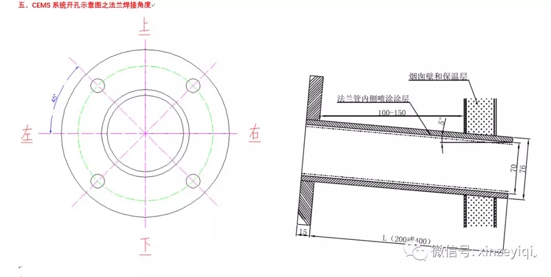 注意:開孔位置及法蘭之間的距離尺寸可以按照開孔示意圖來開孔施工,開孔的大小要根據煙氣在線監測設備生產廠家的實際法蘭大小以及盲管直徑的粗細來施工。